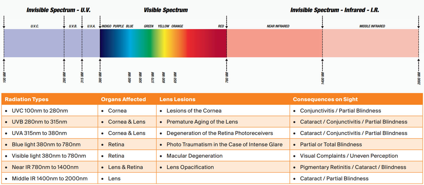 The sun emits three types of light waves and without the correct eye protection each in its own way can seriously affect the eye: