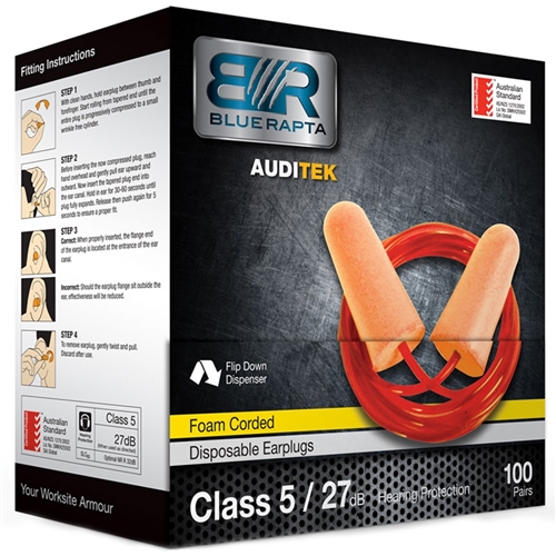 Blue Rapta Auditek 27dB CL5 Corded Earplugs (Bx 100pr)
